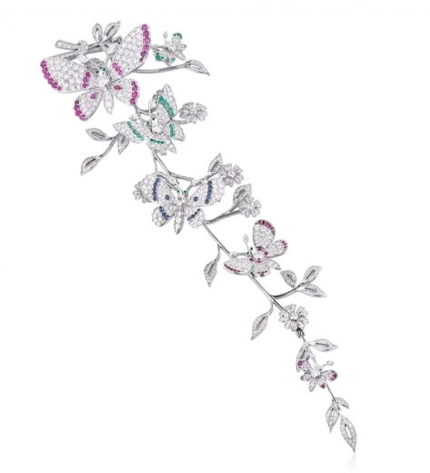 The brooch is made of 750 white gold. 20 round-cut sapphires with a total weight of 0.33 carats. Intense Blue Ceylon. 56 round-cut rubies with a total weight of 1.51 carats. Intense Red. 32 round-cut emeralds with a total weight of 0.31 carats. Intense Green. 787 round-cut diamonds with a total weight of 6.18 carats. G-H/VS. Product length 18 cm