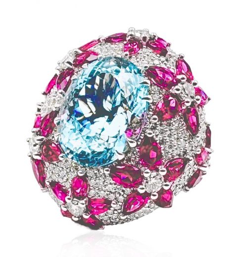 The ring is made of 750 white gold. 1 Pear Cut Aquamarine weighing 11.7 carats Santa Marina Blue (GFCO Gem Lab). 40 pink Pear-cut Rubellites weighing 8.25 carats and 413 round brilliant-cut Diamonds weighing 4.29 carats F-H/VS.