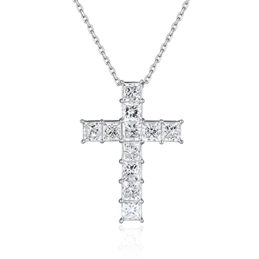 The cross is made of 750 white gold. 11 Asscher-cut diamonds with a total weight of 5.67 carats. G-H/VVS-VS.