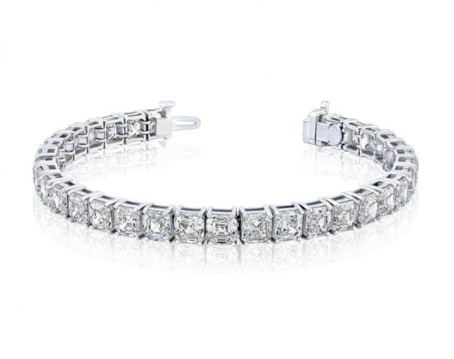 The bracelet is made of 750 white gold. 33 Asher-cut diamonds with a total weight of 24.05 carats. F-G/VVS-VS. (GIA certificate for each stone).