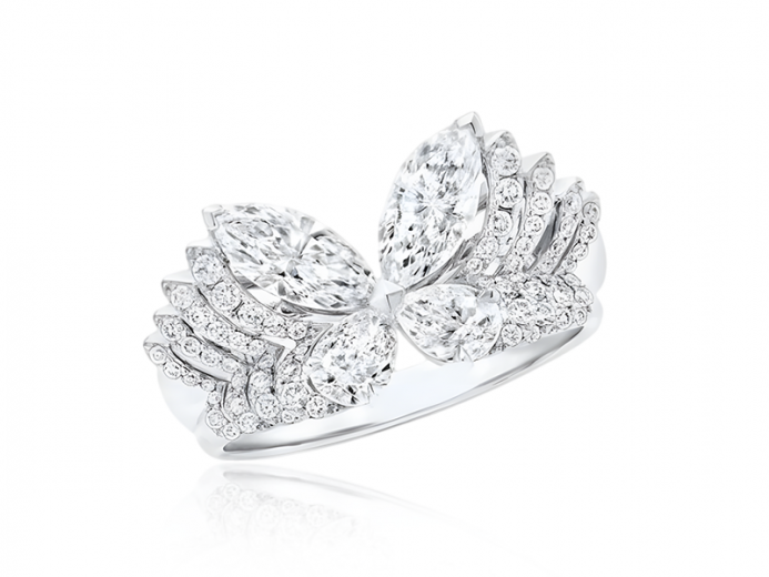 The ring is made of 750 white gold. 2 Marquis-cut diamonds weighing 1.05 — 1.04 carats. F-G/VVS2. Certificates GIA 2496546740 — 6237133947. 2 Pear-cut diamonds weighing 0.50 — 0.50 carats. F/VS1-VS2. Certificates GIA 6471981427 — 6471949829. 75 Round-cut diamonds with a total weight of 0.45 carats. F-G-H/VVS-VS.