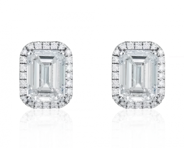 The earrings are made of 750 white gold. 1 Emerald-cut diamond weighing 3.03 carats. F/VS1. GIA Certificate 1467028494. 1 Emerald-cut diamond weighing 3.031 carats. F/VS1. GIA Certificate 2456827187. 48 round-cut diamonds with a total weight of 0.37 carats. G/VS.