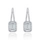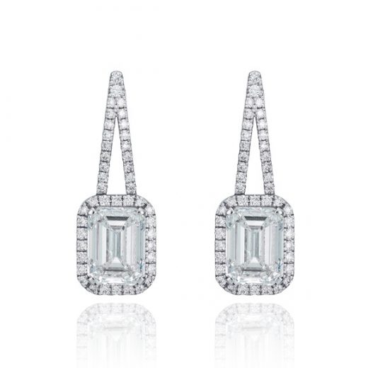 The earrings are made of 750 white gold. Weight: 7.03 grams. 2 central emerald-cut diamonds 3.03 carats F/VS1 (GIA 1467028494) — 3.01 carats F/VS1 (GIA 2456827187). Round-cut diamond pavé with a total weight of 0.62 carats G/VS. Pin closure.