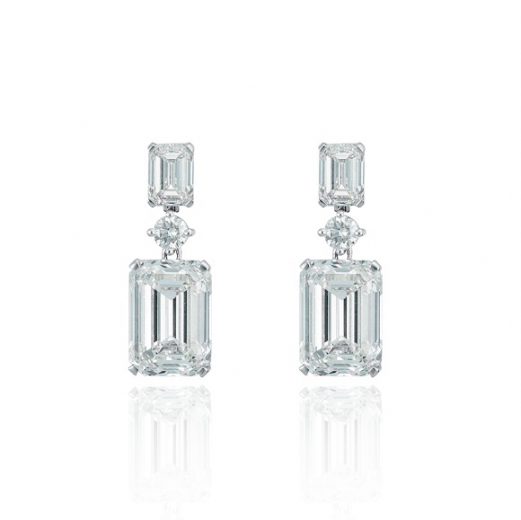 The earrings are made of 750 white gold. Weight: 6.88 grams. 2 central emerald-cut diamonds 5.00 G/VVS1 (GIA 5453884569) — 5.02 G/VVS2 (GIA 2221342657). 2 emerald cut diamonds 0.80 G/VVS2 (GIA 2476016558) — 0.80 G/VS1 (GIA 6462744619). 2 round-cut diamonds with a total weight of 0.30 carats G/VS. Pin closure.