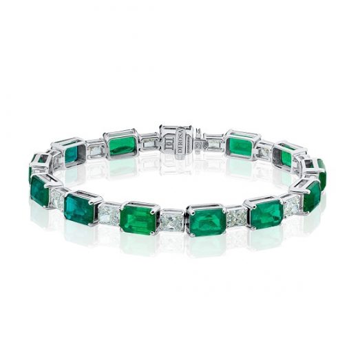 The bracelet is made of 750 white gold, weight: 16.09 grams. Octagon-cut emeralds with a total weight of 13.61 carats, Green — Intense Bluish Green. Radiant cut diamonds with a total weight of 2.47 carats, F-G/VS. The size of the bracelet is 17.5 cm.