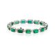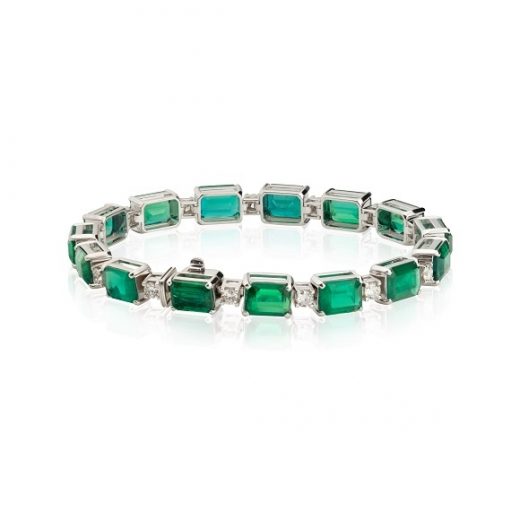 The bracelet is made of 750 white gold, weight: 21.41 grams. Octagon-cut emeralds with a total weight of 22.83 carats, Green — Intense Bluish Green. Round-cut diamonds with a total weight of 1.34 carats, E-G/VS. The size of the bracelet is 17.5 cm.