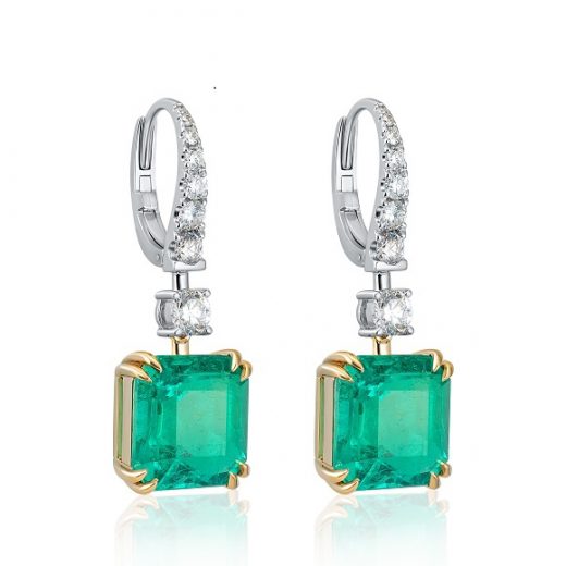 The earrings are made of white and yellow 750 gold. Weight: 8.12 grams. 1 natural emerald — 5.23 carats, color: Green. 1 natural emerald — 4.91 carats, color: Green. 0.90 carat round-cut diamond pavé G-H/VS.
