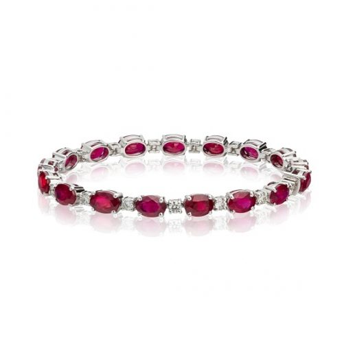 The bracelet is made of 750 white gold. Weight: 15.83 grams. Oval-cut rubies with a total weight of 20.02 carats Red-Intense Red (H) Mozambique. Round-cut diamonds with a total weight of 1.51 carats G-H/VS. Bracelet Size: 17.5 cm.