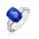 The ring is made of 750 white gold. Weight: 5.30 grams. 1 kushon-cut sapphire of 5.23 carats. Blue (H). 2 trapezoid cut diamonds with a total weight of 0.53 carats G/VS. Size 16.5/52.
