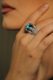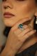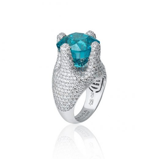 The ring is made of 750 white gold, weight: 15.47 grams. Center Stone: Natural zircon cut kushon 23.58 carats, Greenish Blue. 614 round cut diamonds 4.12 carats G-H/VS. Ring size: 17/54.