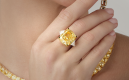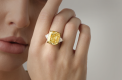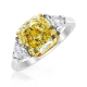 The ring is made of 750 white gold. 1 kushon-cut Diamond 10.02 carats FANCY LIGHT YELLOW/VS1 (GIA 1423226211). 2 trillion-cut Diamonds.