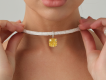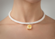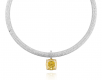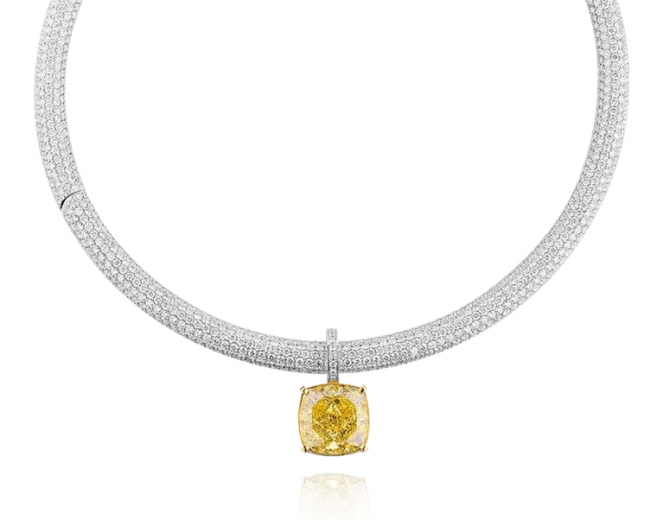The necklace is made of 750 white gold. 1 Kushon cut diamond weighing 21.10 carats. Fancy Light Yellow/VVS2. GIA certificate 2488358333. 1393 Round-cut diamonds with a total weight of 27.25 carats. G-H/VS.
