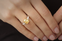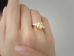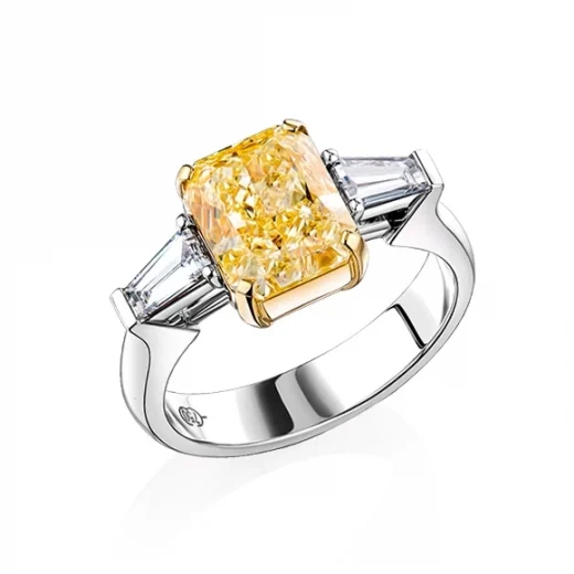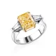 The ring is made of 750 white gold. The central kushon-cut diamond is a 3.55 carat. Fancy Light Yellow/VS2. (GIA 1469479577). 2 Trapezoid-cut diamonds with a total weight of 0.40 carats. F/VS. Size: 16.5/52