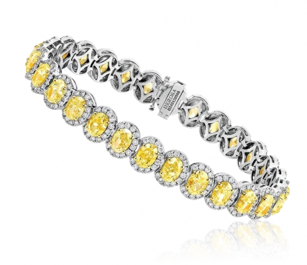 The bracelet is made of 750 white gold. 28 Oval-cut diamonds with a total weight of 17.57 carats. Fancy Light Yellow/VS. 308 round-cut diamonds with a total weight of 3.40 carats. G-H/VS. Size 17
