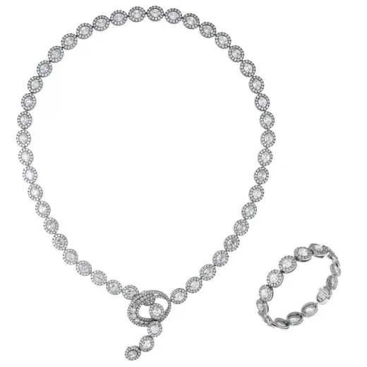 The necklace is made of 750 white gold. 64 Oval-cut diamonds with a total weight of 32.13 carats. E-F-G-H/VVS-VS (GIA Certificate for each Diamond) 988 Round-cut Diamonds with a total weight of 17.58 carats.