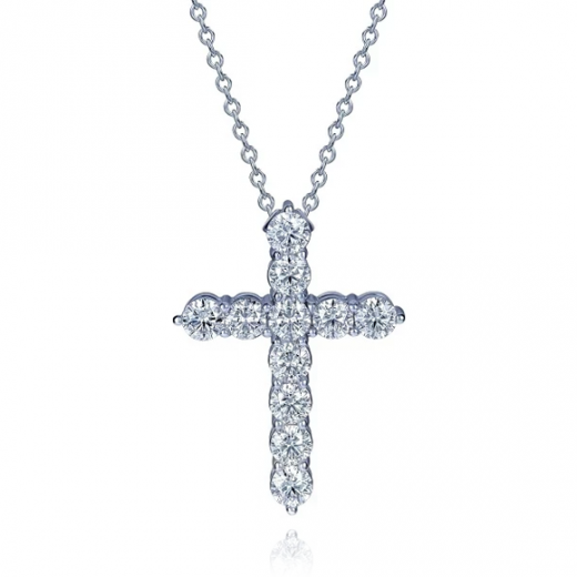 The cross is made of 750 white gold. 11 round-cut diamonds with a total weight of 0.56 carats G-H/VS. The length is adjustable.