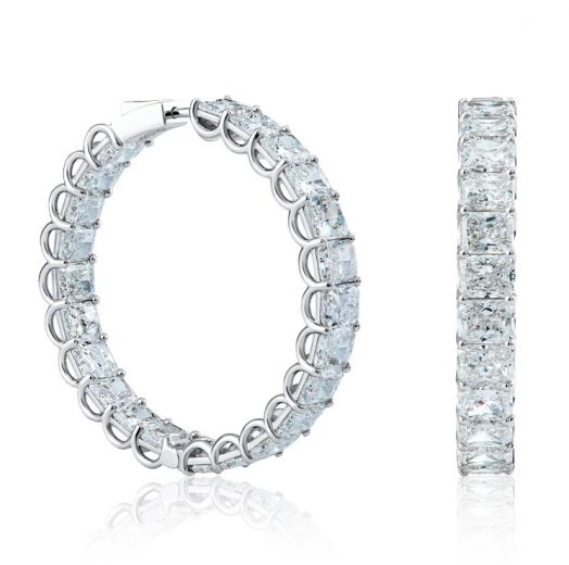 The earrings are made of 750 white gold. Encrusted with 46 Radiant cut Diamonds with a total weight of 23.30 carats F-G/VVS1-VS2 (GIA).