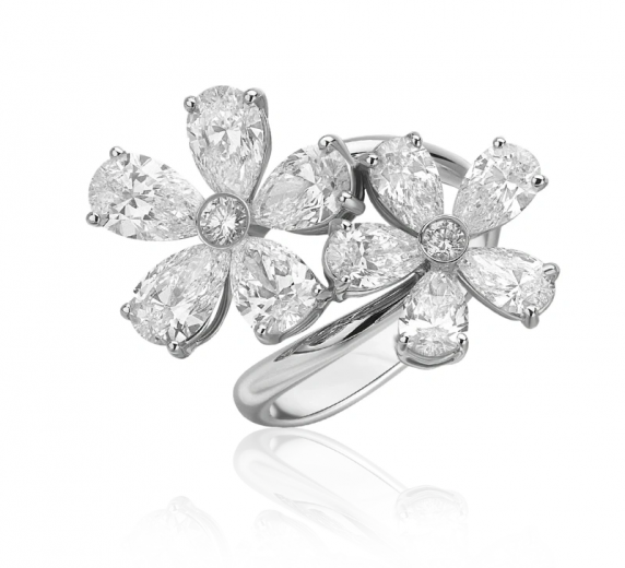 The ring is made of 750 white gold. 10 Pear-cut Diamonds with a total weight of 4.66 carats F-H/VVS2-VS2. 2 Round-cut diamonds with a total weight of 0.13 carats. G/VS. Size 54/17