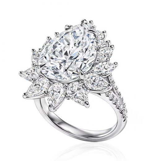 The ring is made of 750 white gold. 5.01 carat round-cut central diamond D/VS1 EXEX SB GIA 2476099272. 14 diamonds around a 2.82 carat central diamond F-G/VVS. Size 17