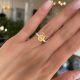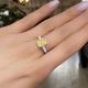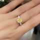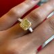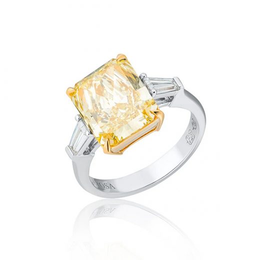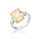 The ring is made of 750 white gold. 1 Diamond shaped Radiant weighing 5.02 car Fancy Yellow/VVS2. GIA 6193954354 Size: 17/52