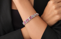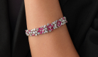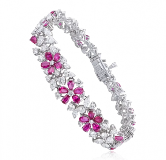 The bracelet is made of 750 white gold. 4 Marquis-cut rubies with a total weight of 0.35 carats. Intens Red. 8 round-cut rubies with a total weight of 0.75 carats. Intens Red. 19 Pear-cut rubies with a total weight of 3.94 carats. Intens Red. 18 Pear-cut diamonds with a total weight of 2.29 carats. F-G/VVS. 19 Marquis cut diamonds with a total weight of 1.92 carats. F-G/VVS. 49 round-cut diamonds with a total weight of 3.65 carats. G-H/VS. Size 17.5