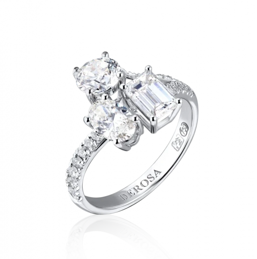 The ring is made of 750 white gold. 1 Oval-cut diamond weighing 0.50 carats. H/VVS. 1 Emerald-cut diamond weighing 0.70 carats. G/VVS. 1 Round-cut diamond weighing 0.70 carats. G/VVS. Size 53/17