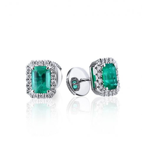 The earrings are made of 750-proof white gold with 2 natural Octagon-cut emeralds with a total weight of 1.42 ct. The color is Green. Origin — Zambia. 36 diamonds of classic cut shape with a total weight of 0.29 ct. H/VS. Size 8 x 10 mm. Weight — 4.10 gr.