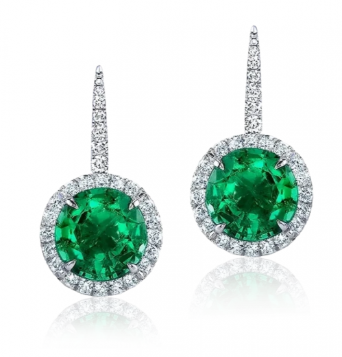 The earrings are made of 750 white gold. 2 round-cut emeralds weighing 4.40 — 3.97 carats. Vivid Green (CE(O):Minor). Certificates GRS2024-060489/GRS2024-058359. 58 Round-cut diamonds with a total weight of 1.24 carats. F-G/VS.
