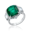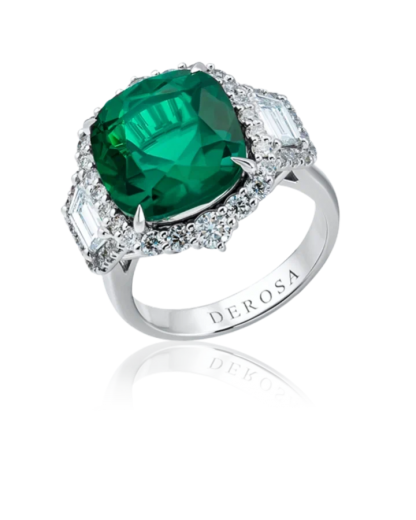 The ring is made of 750 white gold, encrusted with a 7.17 carat Vivid Green Colombia Emerald and 2 trapezoidal diamonds weighing 0.69 carats F-G/IF-VVS GIA 6412113298/64111122122, and a diamond paver of 46 round-cut diamonds weighing 0.79 carats