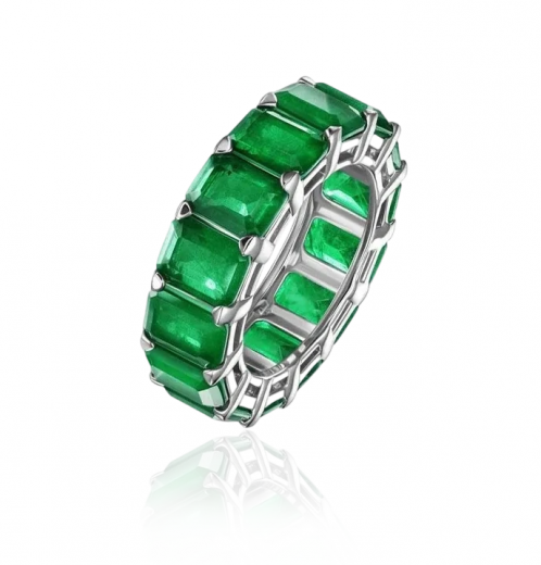 The ring is made of 750 white gold. 17 Emeralds with a total weight of 9.30 carats. Green. Size 53/17.5