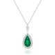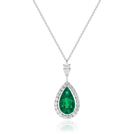 The pendant is made of 750 white gold. 1 Pear-cut emerald weighing 0.76 carats Green Zambia. 1 Pear-cut diamond weighing 0.18 car G-H/VS and 22 round-cut diamonds weighing 0.32 car. Length: adjustable. Weight: 5.34 g.