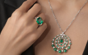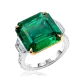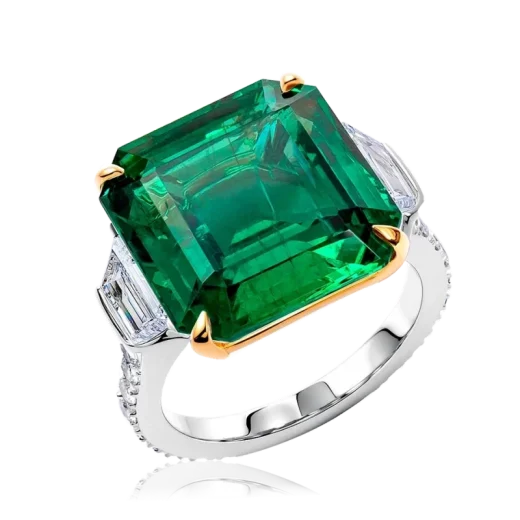 The ring is made of white and yellow 750 gold. 1 Octagonal cut Emerald weighing 11.78 carats. Intense to VIVID GREEN (CE(O): Minor. (ZAMBIA). The certificate is GRS 2023-117058. Bellerophon Certificate B12981. 1 Trapezoid cut diamond weighing 0.51 carats. E/VS2. GIA Certificate 6431839093. . 1 Trapezoid cut diamond weighing 0.50 carats. D/VS2. GIA Certificate 1439844102. 20 Round cut diamonds with a total weight of F-G-H/VS.