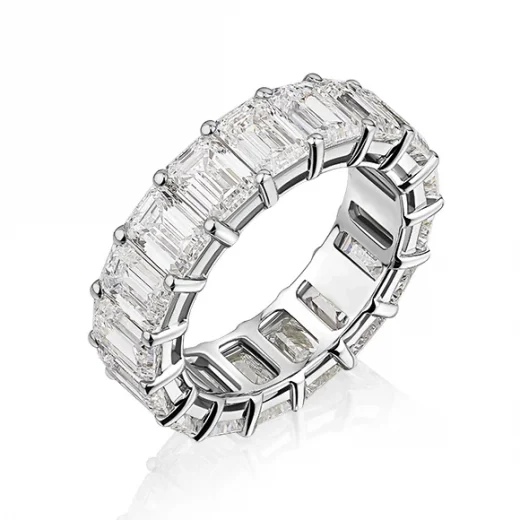 The ring is made of 750 white gold. 18 Emerald-cut diamonds with a total weight of 9.05 carats. F-G-H/VVS1-VS2. GIA certificate for each stone. Size 53/17