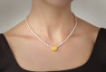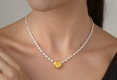 The necklace is made of 750 white gold. 1 10.03 carat Heart-cut diamond. Fancy Intensity Yellow/VVS1 (GIA 7438985716). 67 Pear-cut diamonds with a total weight of 11.82 carats. E-F-G/VVS-VS. 1 0.042 carat round cut diamond. Length: 39 cm.