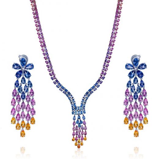 The necklace is made of 750 white gold with 228 sapphires with a total weight of 74.99 carats. 26 pear-cut sapphires — 11.92 carats, 102 oval-cut sapphires — 29.33 carats. 100 emerald-cut sapphires — 33.74 carats. Necklace length: 53 cm. The EARRINGS are made of 750 white gold with 62 sapphires with a total weight of 17.72 carats. 52 pear-cut sapphires — 13.39 carats. 10 pear-cut sapphires — 4.33 carats. Weight of earrings: 15.24 grams. Earrings length: 5.3 cm. Italian clasp.