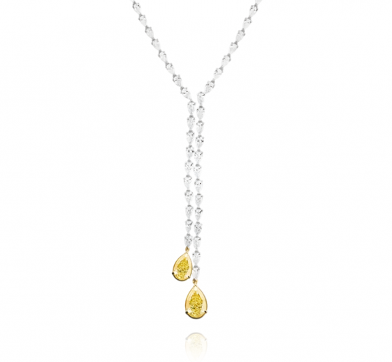 The necklace is made of 750 white gold. 2 Pear-cut diamonds weighing 3.01 — 5.51 carats. Fancy Light Yellow/VS2. Certificates GIA 3475209990 — 3475076659. 50 Margiz cut diamonds with a total weight of 7.82 carats. E-F-G/VVS-VS. 55 Pear-cut diamonds with a total weight of 10.15 carats. E-F-G/VVS-VS.