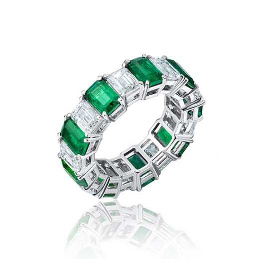The ring is made of 750 white gold. 9 octagon-shaped emeralds, Green-Intense green Zambia weighing 5.15ct. 9 emerald-shaped diamonds, G-H/VVS-VS weighing 4.62ct. GIA 6639-1937-8033-5591-9727-1691-5380-0777-2227 Weight: 6.22 gr. Size: 17