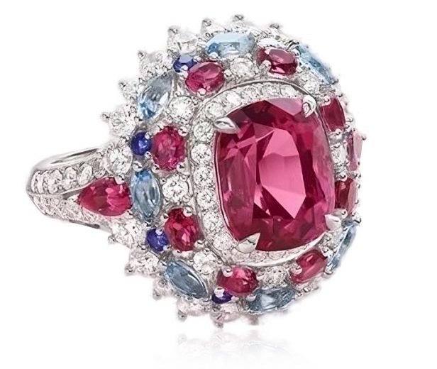 The ring is made of 750 white gold. 1 Cushion-cut Rubellite weighing 6.89 carats Vivid Pinkish-Red (GFCO Gem Lab). Encrusted with 8 Marquis-cut Aquamarines weighing 0.97 carats, 2 Pear-cut Rubellites weighing 0.37 carats, 8 Oval-cut Rubellites weighing 1.42 carats, 8 Round-cut Sapphires weighing 0.68 carats and 86 Round-cut Diamonds weighing 2.42 carats F-G-H/VS.