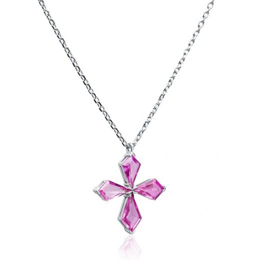 The cross is made of 750 white gold, weight: 5.10 grams. Pink sapphires cut «whale» with a total weight: 2.84 carats. The size of the cross: 2.0 x 2.0 cm . Chain length: 44 cm.