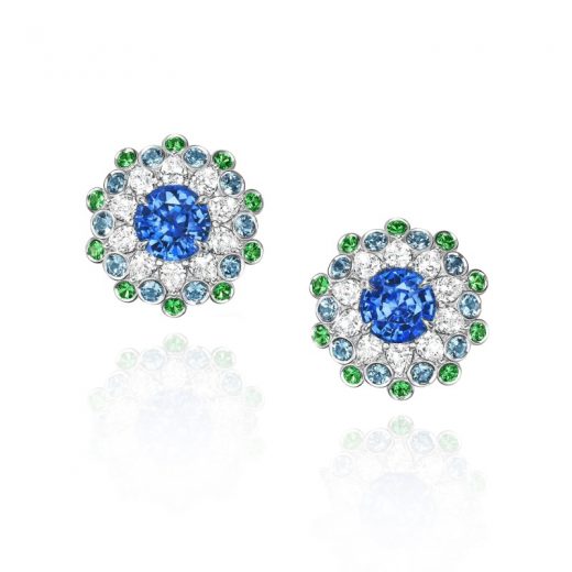 The earrings are made of 750 white gold. 2 Sri Lanka Ceylon Round sapphires, 2.61-3.12 car. 20 Pear-cut Diamonds weighing 2.87 car F-H/VS. 20 round-cut Aquamarines weighing 1.37 carats and 20 round-cut Cavorites weighing 1.38 carats. Product weight: 10.87 g.