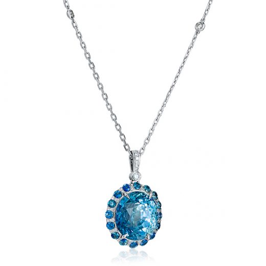 The pendant on the chain is made of 750 white gold, 1 Oval Mixed Cut sapphire 31.00ct Blue Sri Lanka IGI certificate, inlaid with 16 sapphires weighing 2.04 carats and 108 round-cut diamonds with a total weight of 1.35 carats G/VS.