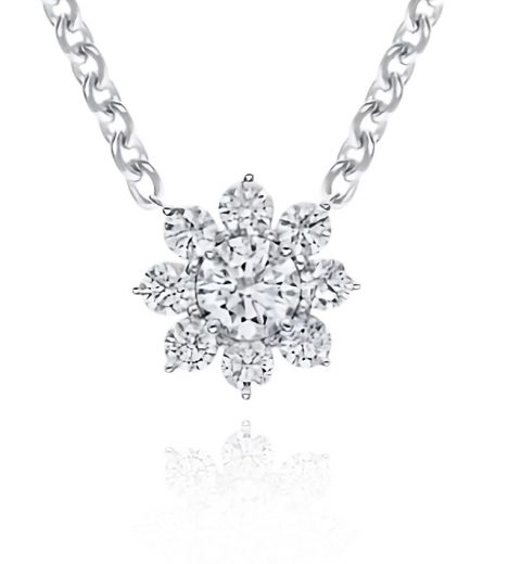 The pendant is made of 75-proof white gold. 1 Round-cut diamond weighing 0.70 carats F/VVS2 (GIA 6482157256). 8 round-cut diamonds weighing 1.29 carats G-H/VS.