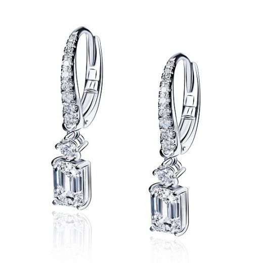 The earrings are made of 750 white gold. The weight is 3.64 grams. 1.01 carat emerald-cut diamond F/VS1 GIA-certificate. 1.01 carat emerald-cut diamond F/VS1. GIA -certificate. Diamond pavé. Earrings length: 2.5 cm. French lock with spring fastener.
