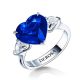 The ring is made of 750 white gold, weight: 4.69 grams. The central stone is a natural sapphire cut «heart» 5.15 carats. Color: Vivid Blue (Royal Blue). (H). 2 side diamonds «pear» cut 0.62 carats G/VS. Ring size: 16.3/51.