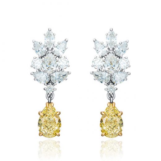 The earrings are made of 750 white and yellow gold. Weight 10.12 g. 2 Pear-cut diamonds weighing 3.01 car FLY/VVS1 and 3.00 car FLY/VS2 (Certificates GIA 7452652687/7421090638). 2 Pear-cut diamonds weighing 0.50 car F/VS1 and 0.51 car F/VS1 (Certificates GIA 1478615563/ 7466805624). 16 round-cut and pear-cut diamonds with a total weight of 3.54 car F/VVS-VS.