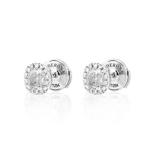 The earrings are made of 750 white gold, 2 kushon-cut diamonds 1.1 carats G/VVS1-VVS2, 28 round cut diamonds 0.24 carats G/VS.