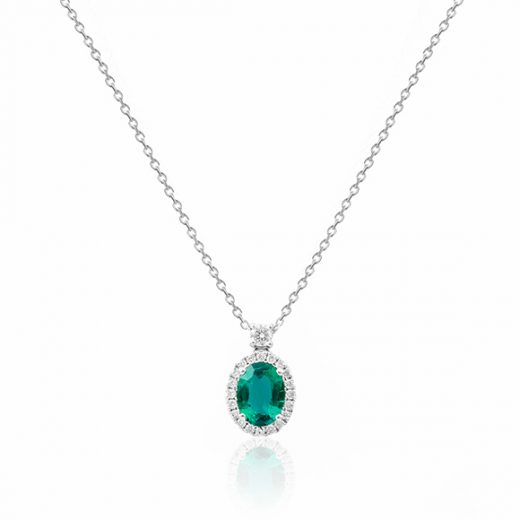 The pendant is made of 750 white gold, 1.06 carat oval-cut emerald, 21 round-cut diamonds 0.26 carats H/VS.